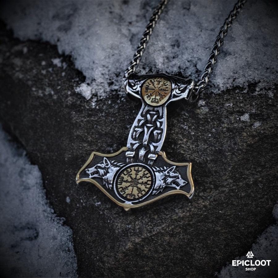 Embrace the power of ancient Norse traditions with this striking Mjolnir pendant, a quintessential piece of Viking jewelry. At its heart, the Vegvisir design stands as a guide on your journey through life, flanked by Odin's loyal wolves, Geri and Freki. The unbreakable Mjolnir, symbol of Thor's might, represents earthly strength and the eternal cycle of death and rebirth. Wear this Mjolnir necklace, and let it serve as a reminder of your own inner power and resilience.
