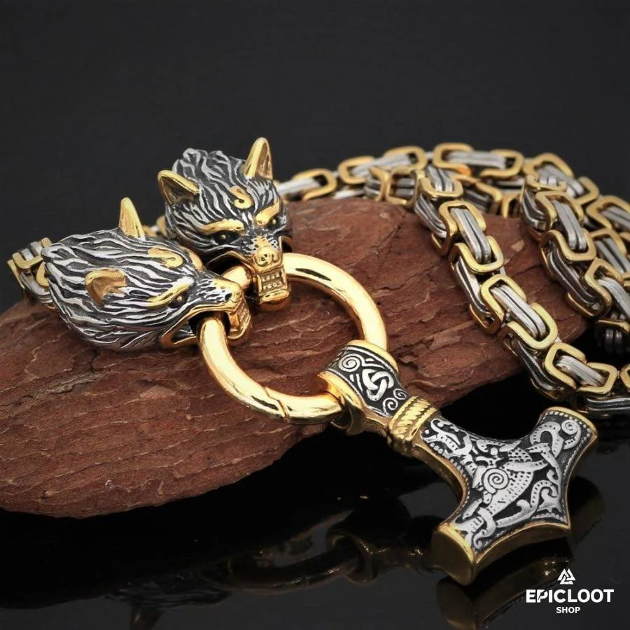 Gold King Chain With Wolf Heads & Mjolnir Pendant
