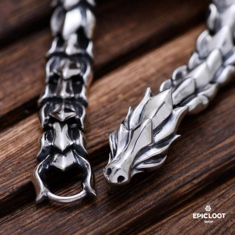 Jormungandr, the Midgard Serpent, or the World Serpent, is a giant serpent or dragon from Norse mythology. This bracelet was inspired by this mythological creature. Wear it as a reminder of your birthright to conquer fears and limitations. This Viking bracelet is a beautiful example of Norse mythology and brilliant craftsmanship. Made with genuine 925 sterling silver, it honors the Midgard Serpent, symbolizing renewal and rebirth.