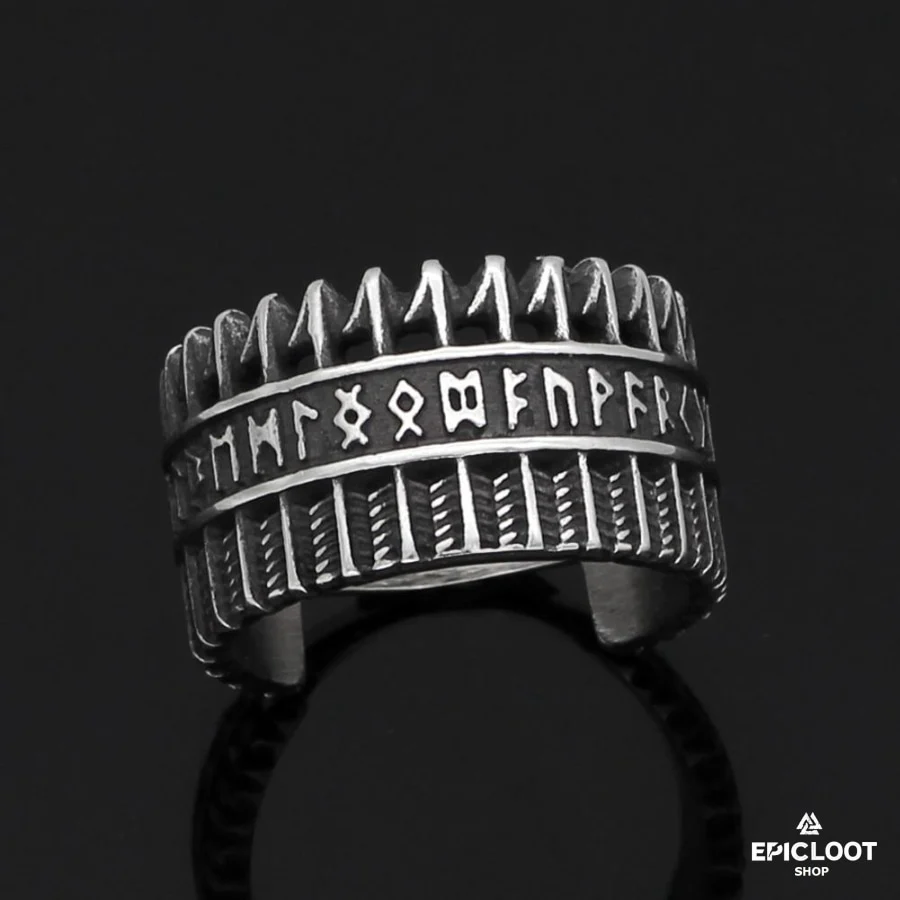 Unlock the secrets of the ancients with this mysterious Nordic Rune Viking Ring. The band of this ring is adorned with the sacred runes of the Elder Futhark, the oldest form of the runic alphabet. Each rune is a symbol of power, a whisper of wisdom from the gods themselves. In Norse tradition, the runes were more than just letters; they were magical signs, imbued with the ability to shape reality and influence the course of fate. Crafted from polished stainless steel, this ring has a sense of timeless elegance, a reminder of the enduring power of the old ways. Wear it as a declaration of your own connection to the ancient wisdom, a talisman of the insight and guidance that the runes provide.
