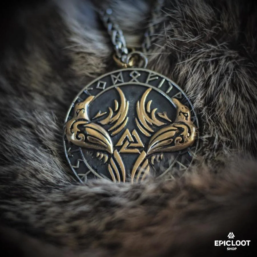 Embody the spirit of the ancient Vikings with this unique, high-quality Viking necklace. Named after Huginn and Muninn, Old Norse deities of thought and memory, two ravens elegantly adorn this pendant, symbolizing Odin's world-traveling informants. The rear features runes whispering "Live Forever in the Halls of Valhalla," framed by the awe-inspiring Helm of Awe emblem. This one-of-a-kind Viking jewelry combines rich heritage and skilled craftsmanship, transporting you to a timeless era.
